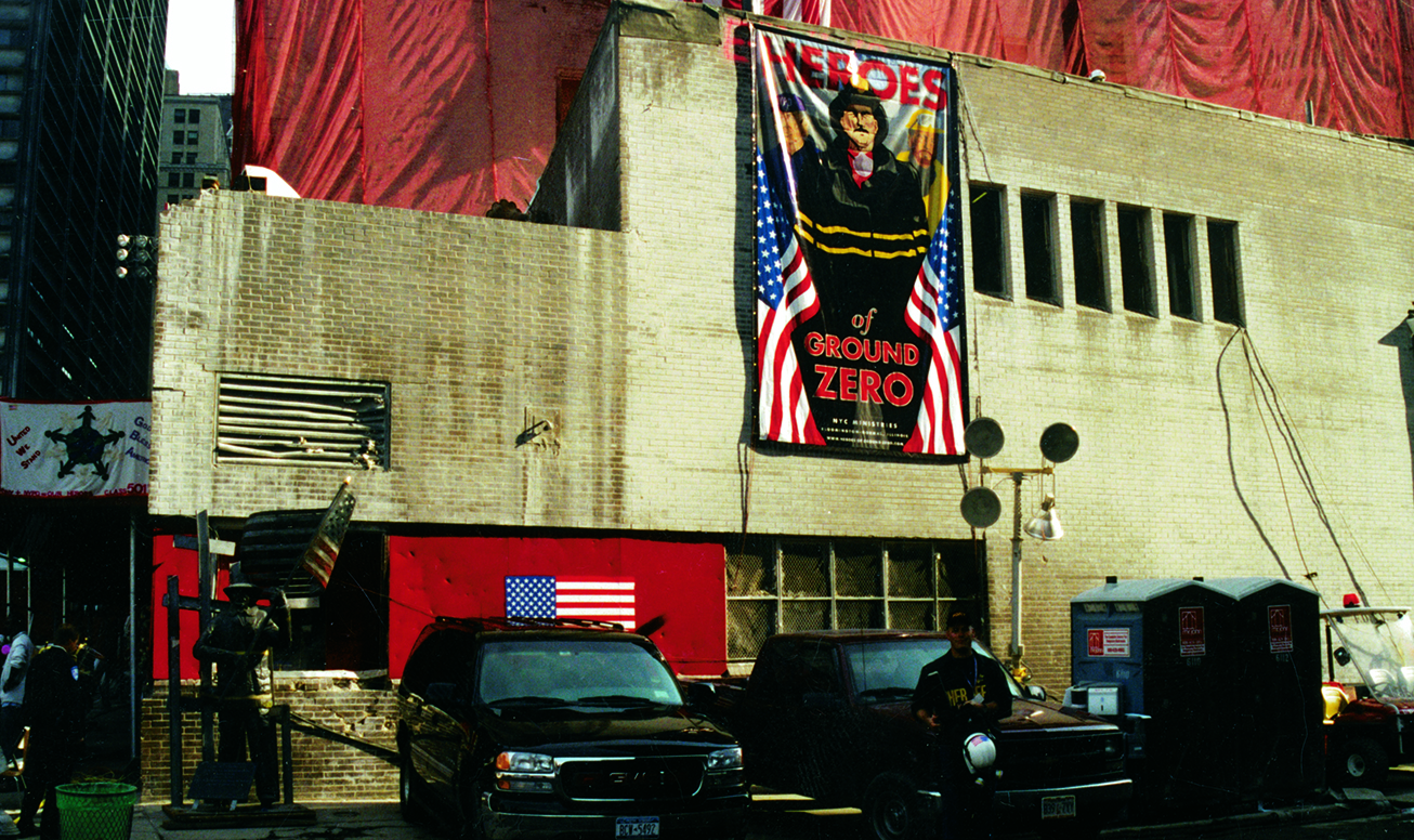 This is a large 10'x20' banner of the same Heroes of Ground Zero artwork that was ordered by the FDNY Chief in charge of Ground Zero to hang on the wall of the 10/10 Fire Station inside Ground Zero while cleanup was underway. It hung on the 10/10 until July of 2002. We don't know what finally happened to it.