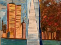 The World Trade Center buildings depicted in my Neoplastic style. The red skies are in full tension.